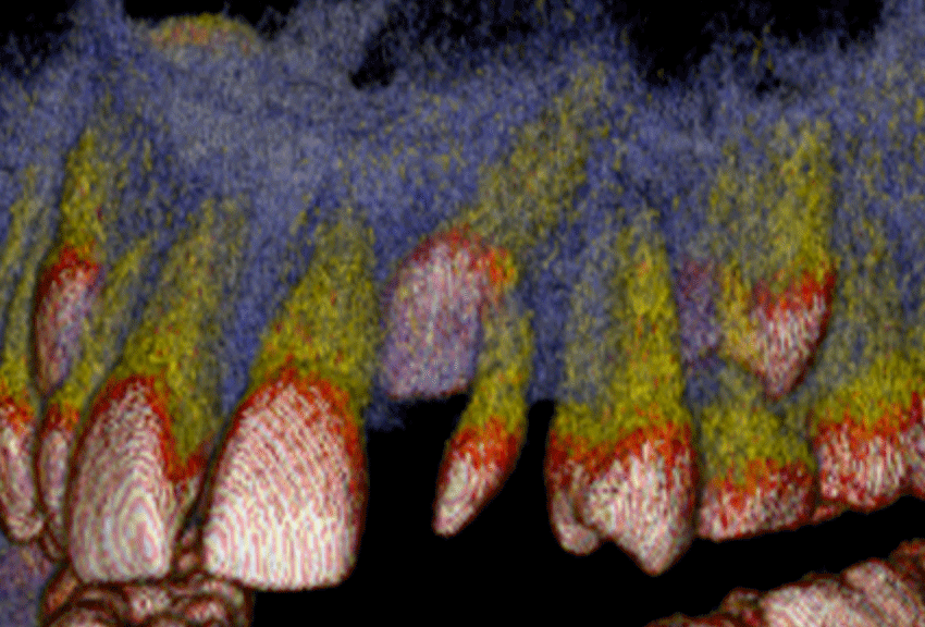The patient is seated in the chair. The machine rotates around the head & emits a collimated cone-shaped x-ray beam. The scan takes 9.6 seconds. 512 computer files are generated. With special software, it is possible to create any number of views from any angle in both 2D and 3D. The examples below show some of the possibilities of this technology.